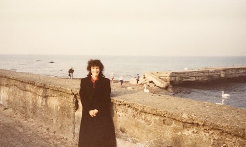 Susie by the ocean in Rostock, East Germany in winter 1989